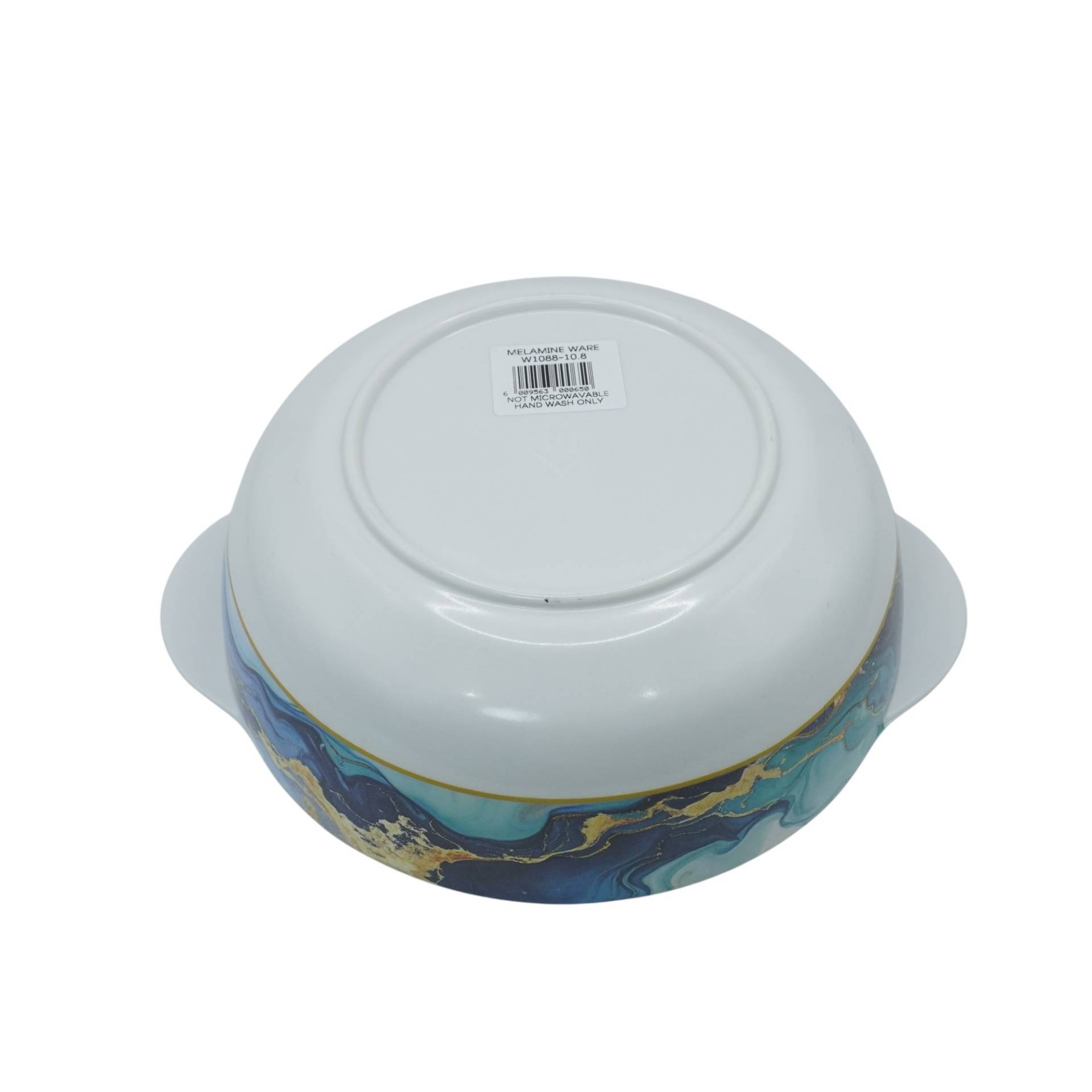 Design Details: Features a vibrant blue marble-patterned exterior with hand-painted gold-rimmed accents on both the bowl and the lid.
